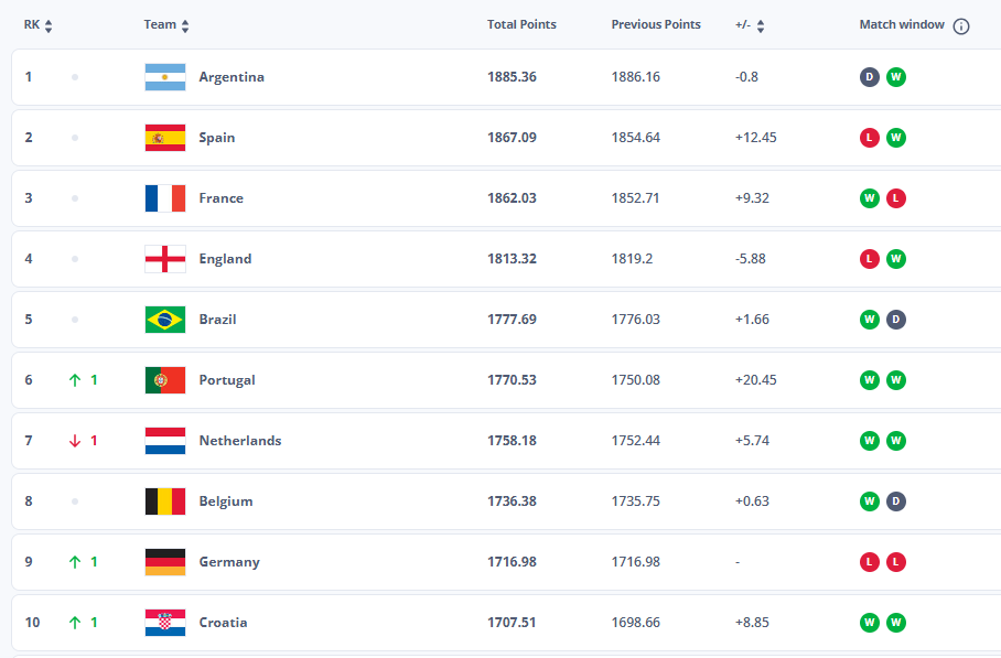 世界杯临近时,各大洲预选赛密集进行,高强度、强对抗的比赛数量明显增加。这种高权重赛事集中出现,是排名波动加剧的主要原因。